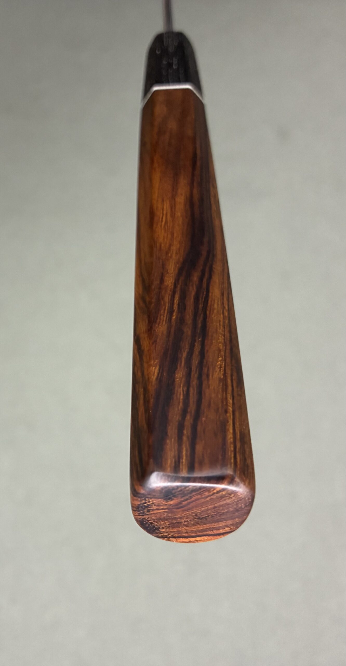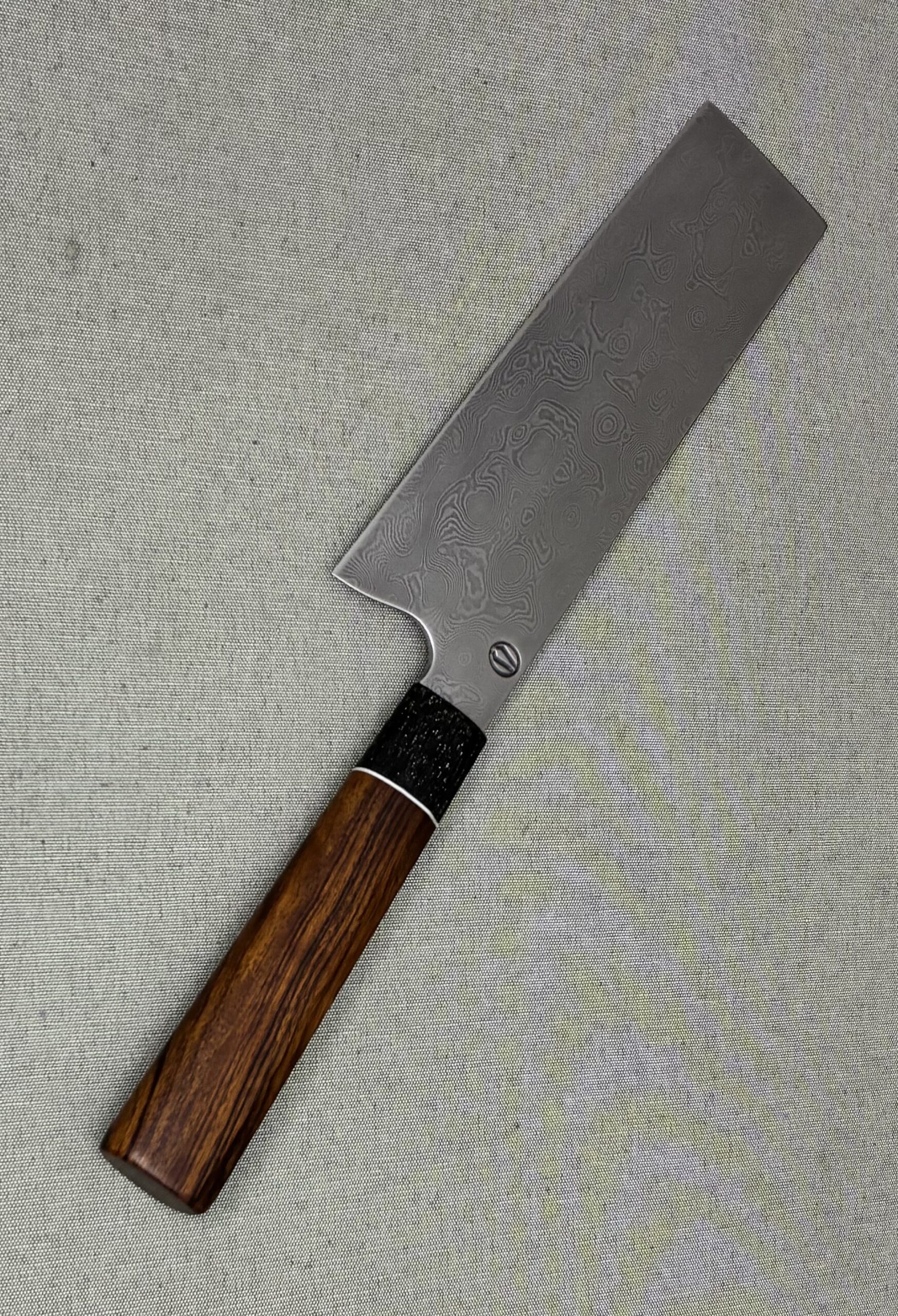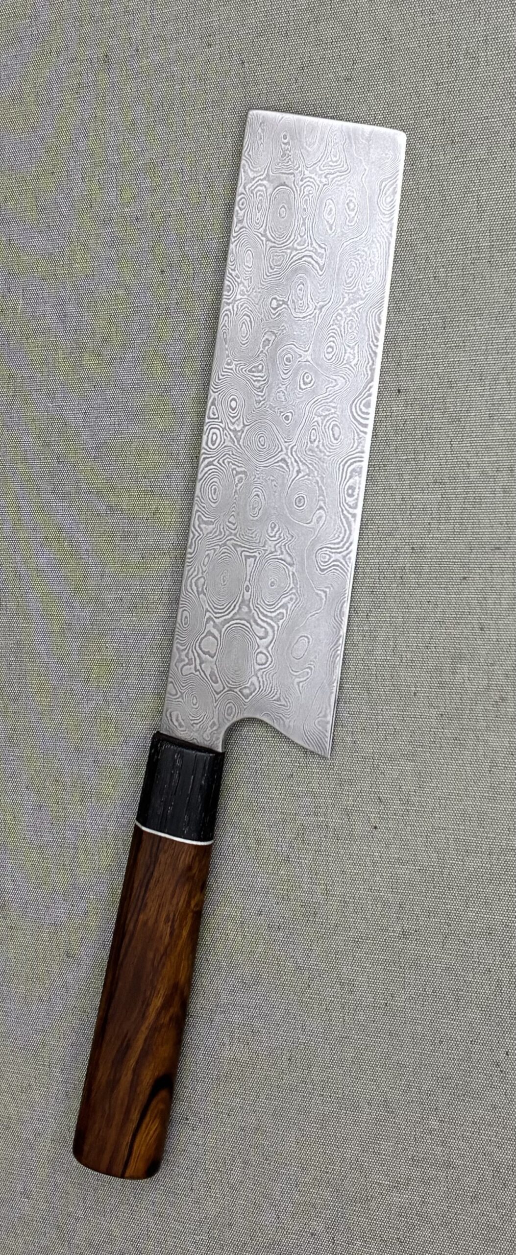Couteau Nakiri en damas ‘goutte de pluie’ (raindrop) de 150 couches alternées de XC100 et 15N20.