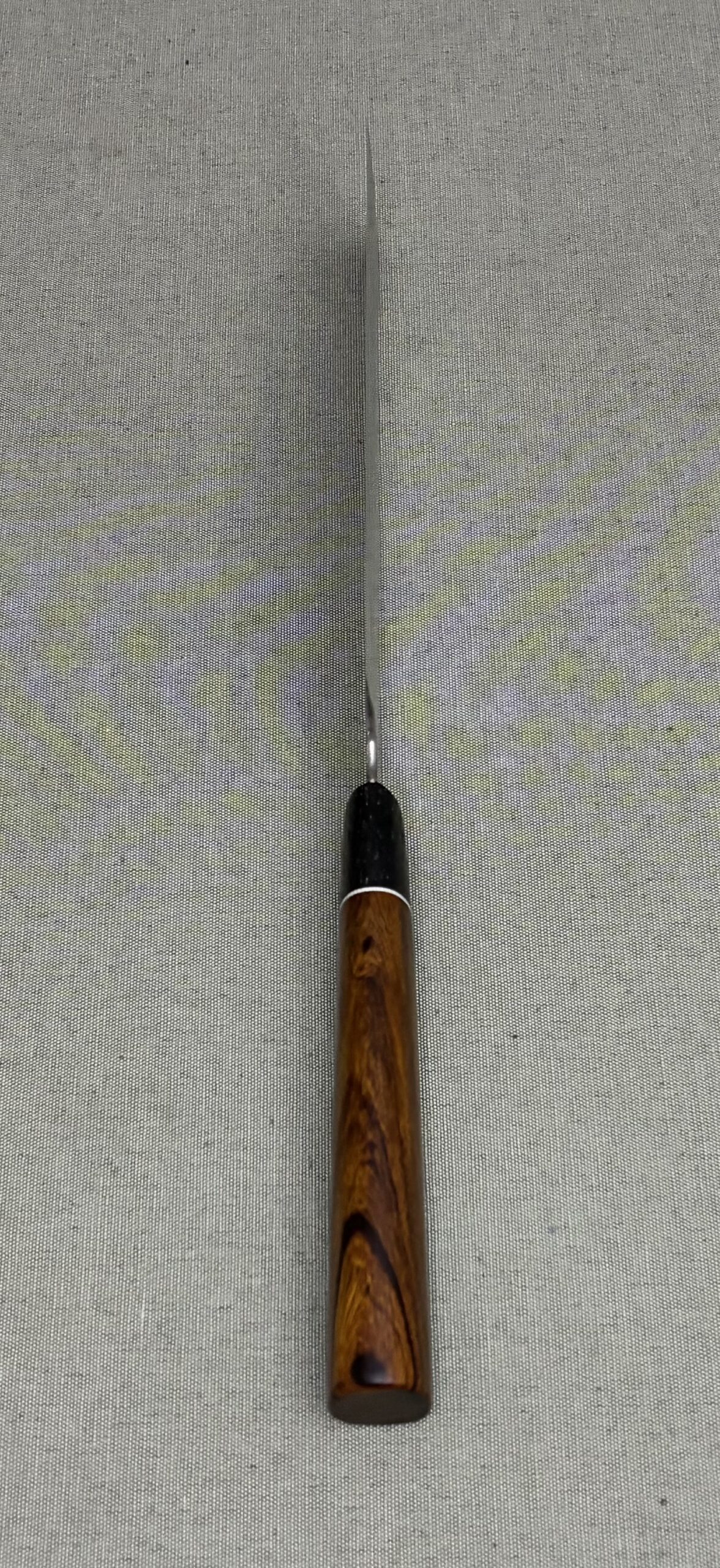 Le couteau Nakiri, d’origine japonaise, est spécifiquement conçu pour découper et hacher des légumes et des herbes. D’où sa lame fine et droite. Sa géométrie ‘laser’ lui confère un tranchant rasoir, ce qui permet de couper sans écraser et ainsi maintenir une certaine fraîcheur des aliments. Le tranchant étant très fin, il n’est donc pas conçu pour découper des aliments congelés et des aliments durs, tels que des os, des noyaux de fruits, etc..