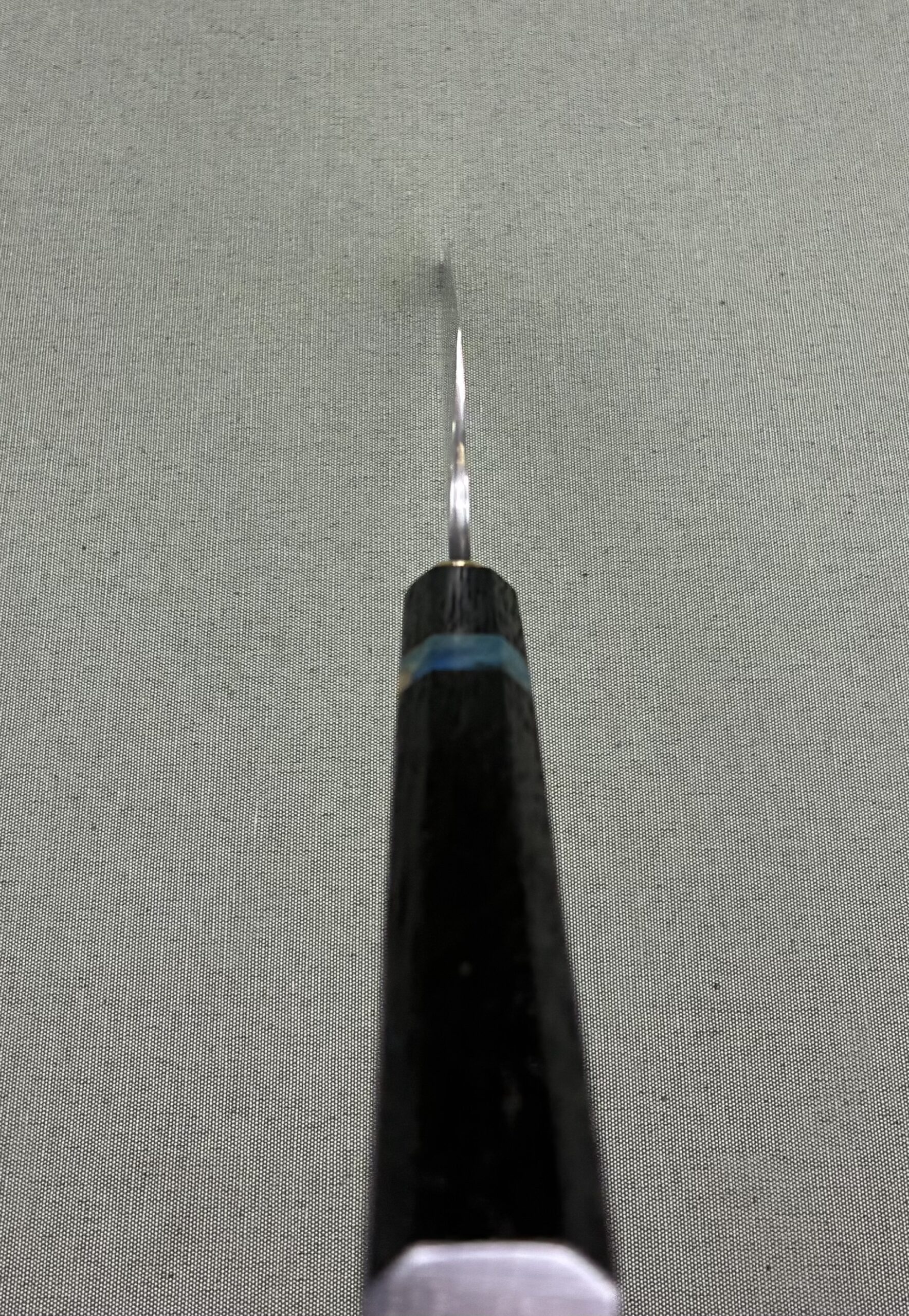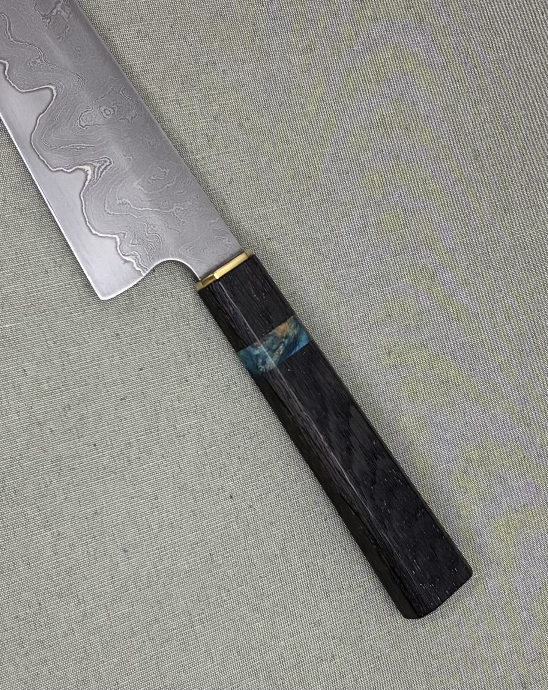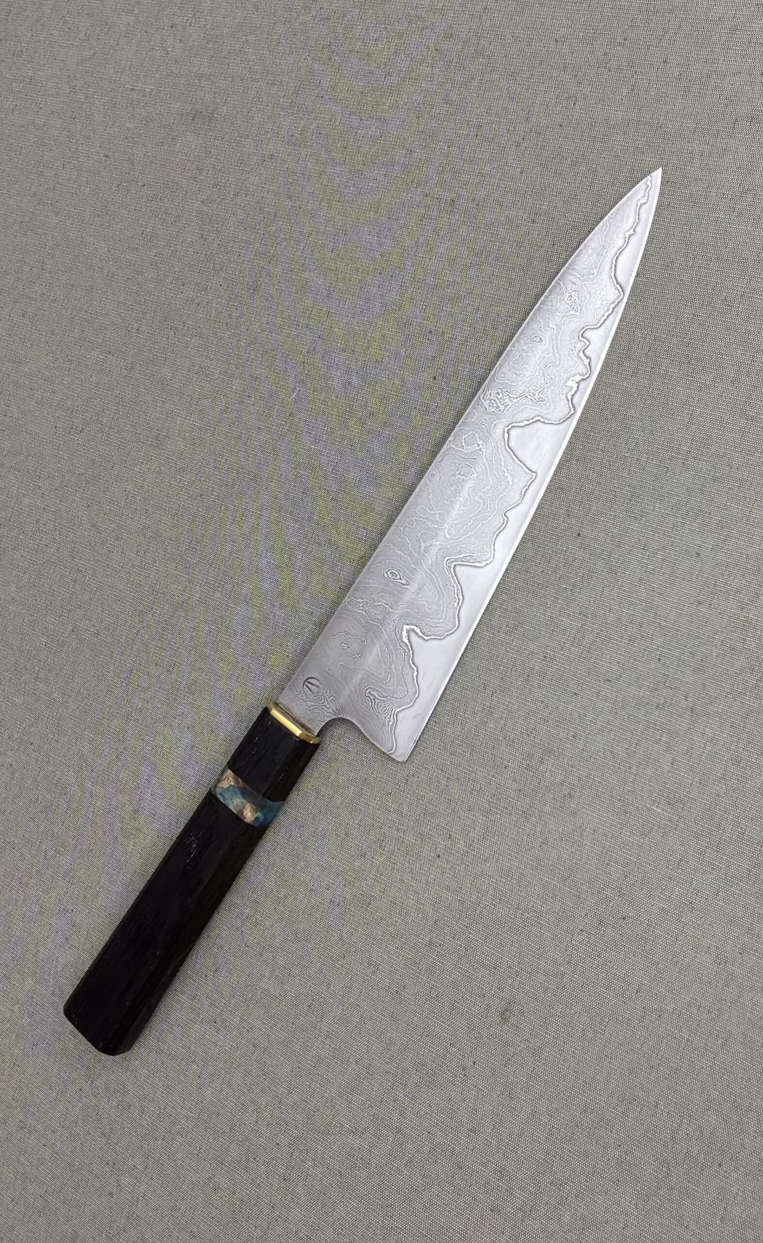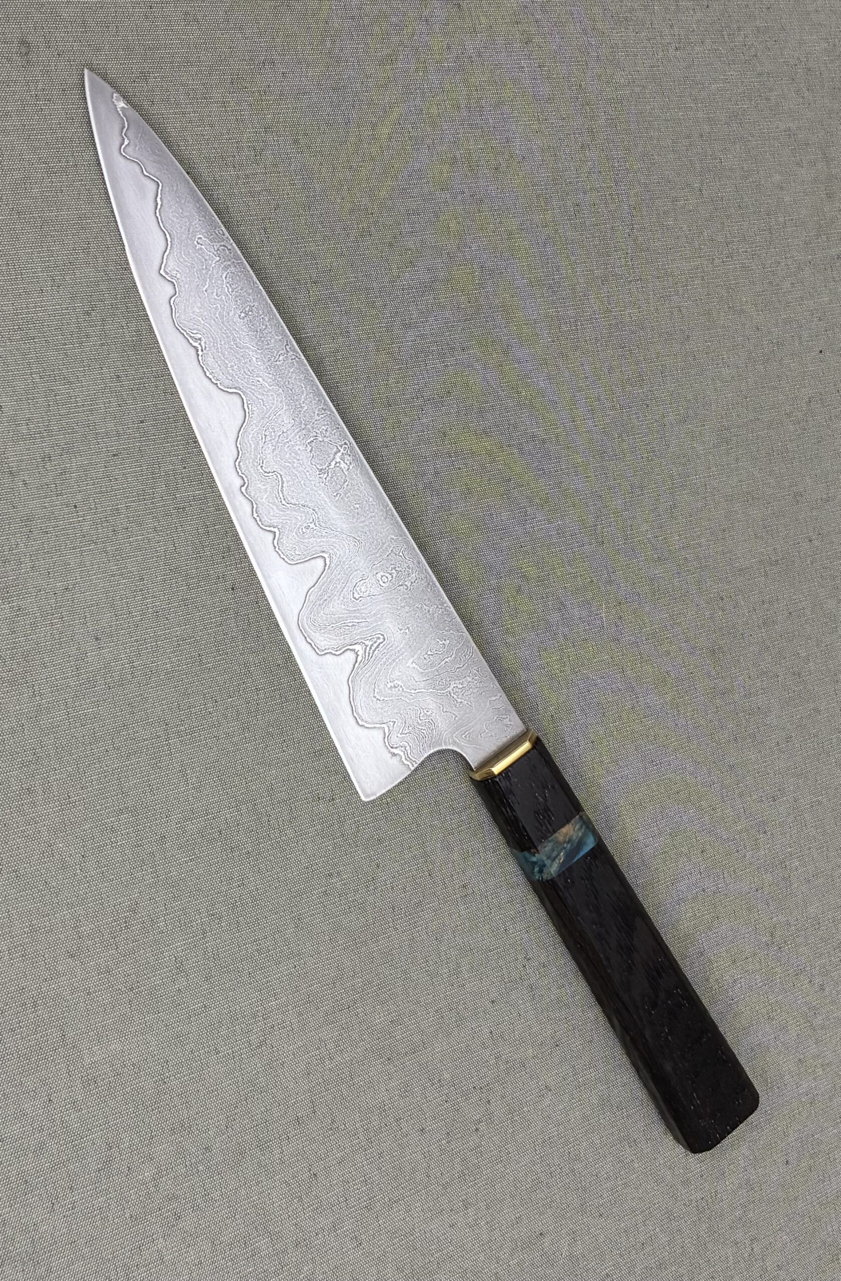 Couteau de chef style ‘Gyuto’ avec une lame Go-Mai composée d’un tranchant en acier 1.2510 (O1) et de flancs composés de nickel pur et d’un acier damas ‘random’ de 300couches. Le damas est réalisé avec les aciers XC75 et 15N20. Le nickel est intégré pour éviter la migration de carbone lors des étapes de forgeage.